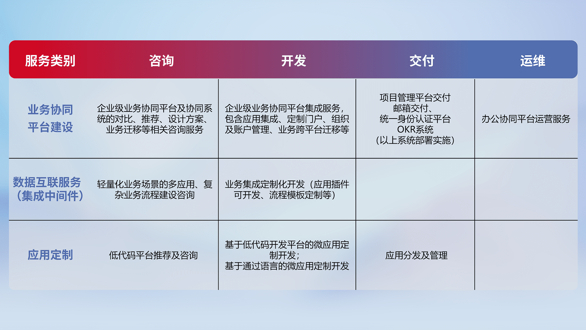 针对钉钉、、企微、、、IDaas等平台级产品提供产品的规划、、方案、、、、交付、、、、定制化开发等服务,,,实现如统一协同办公、、智能客户服务、、、混合会议管理、、智能数据查询、、、、等业务场景,,,,实现数字化转型。。