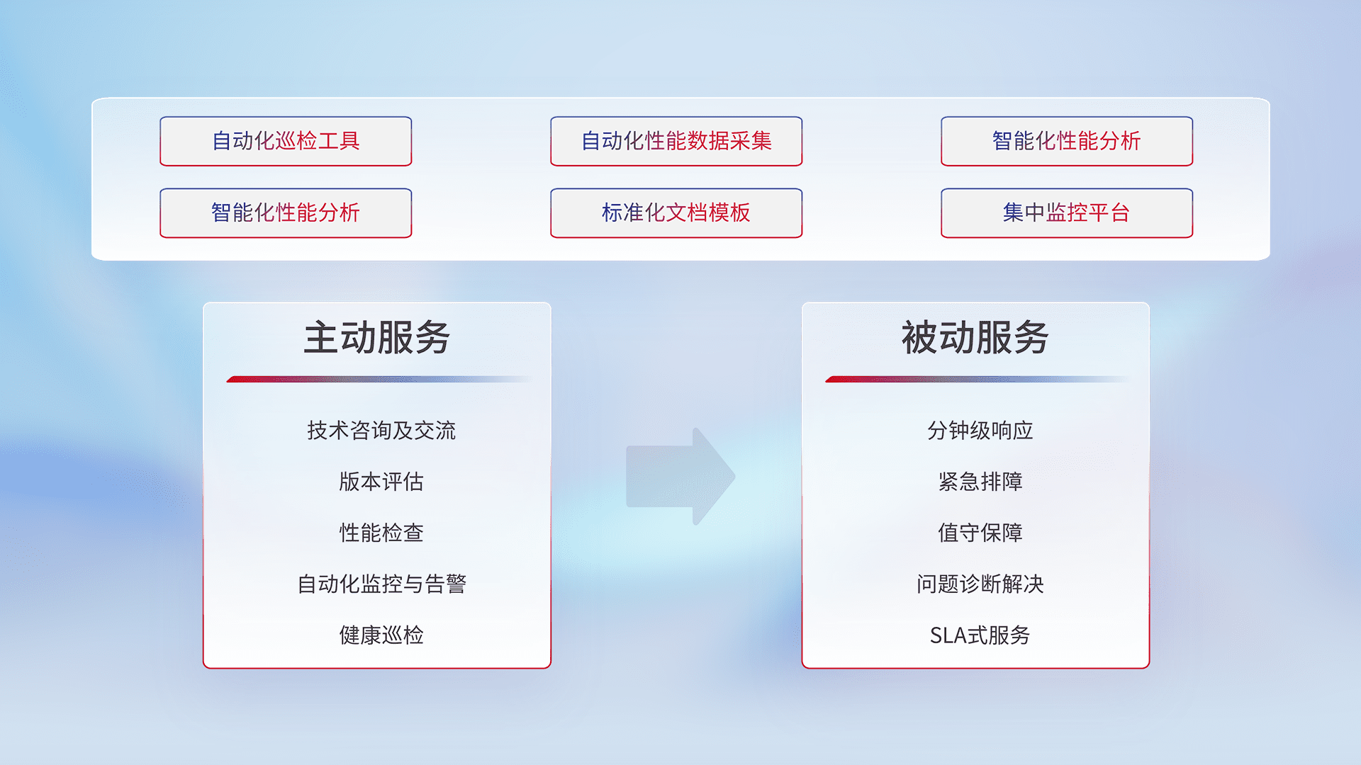 智能化工具和标准化文档,,保障服务质量,,提供主动服务(包含技术咨询、、、、版本评估、、、性能检查、、、自动化监控与告警、、、、健康巡检)和被动服务包含(分钟级响应、、、紧急排障、、、值守保障、、、、问题诊断解决、、、、SLA服务)。。。